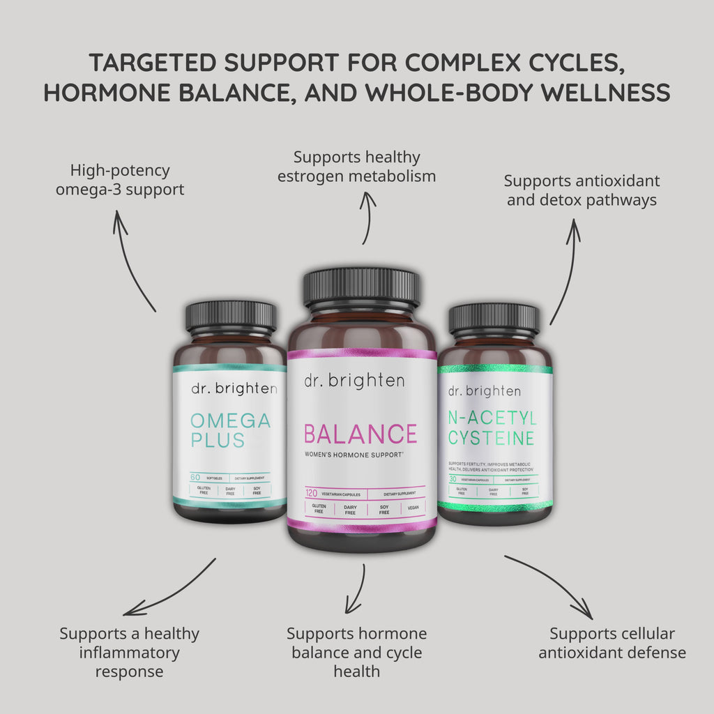 The Complex Cycle Support Kit brings together three targeted formulas designed to support women navigating complex cycles, including those experiencing endometriosis-related challenges. This stack combines Omega Plus, Balance, and N-Acetyl Cysteine to support key foundations that influence cycle comfort and hormonal wellbeing: healthy inflammatory balance, estrogen metabolism and clearance, and cellular antioxidant defenses. Omega Plus provides EPA-dominant omega-3 fatty acids to support inflammatory balance and menstrual comfort, Balance delivers targeted nutrients and botanicals that support healthy estrogen metabolism and progesterone activity, and NAC supports glutathione production and cellular detox pathways for antioxidant resilience. Together, these formulas create a comprehensive daily foundation designed to support cycle comfort, hormonal steadiness, and whole-body resilience throughout the month.